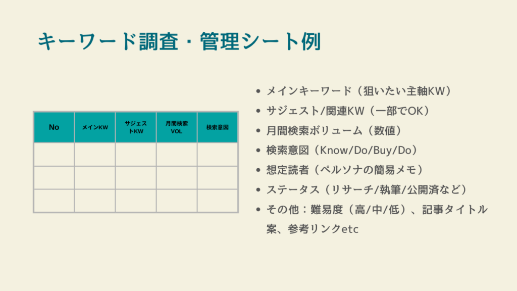 実際に筆者がSEOライティング案件で使っている「キーワード調査・管理用スプレッドシート」を以下に示します。